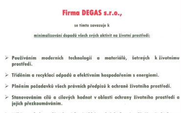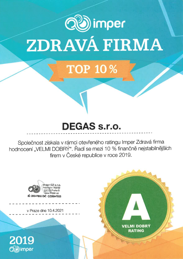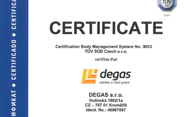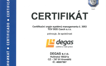 Ve společnosti DEGAS s.r.o. dbáme na dodržování pravidel kontroly kvality, abychom zajistili maximální spokojenost zákazníků. Správnost nastavených postupů potvrzují mimo jiné následující certifikáty, které firma získala: